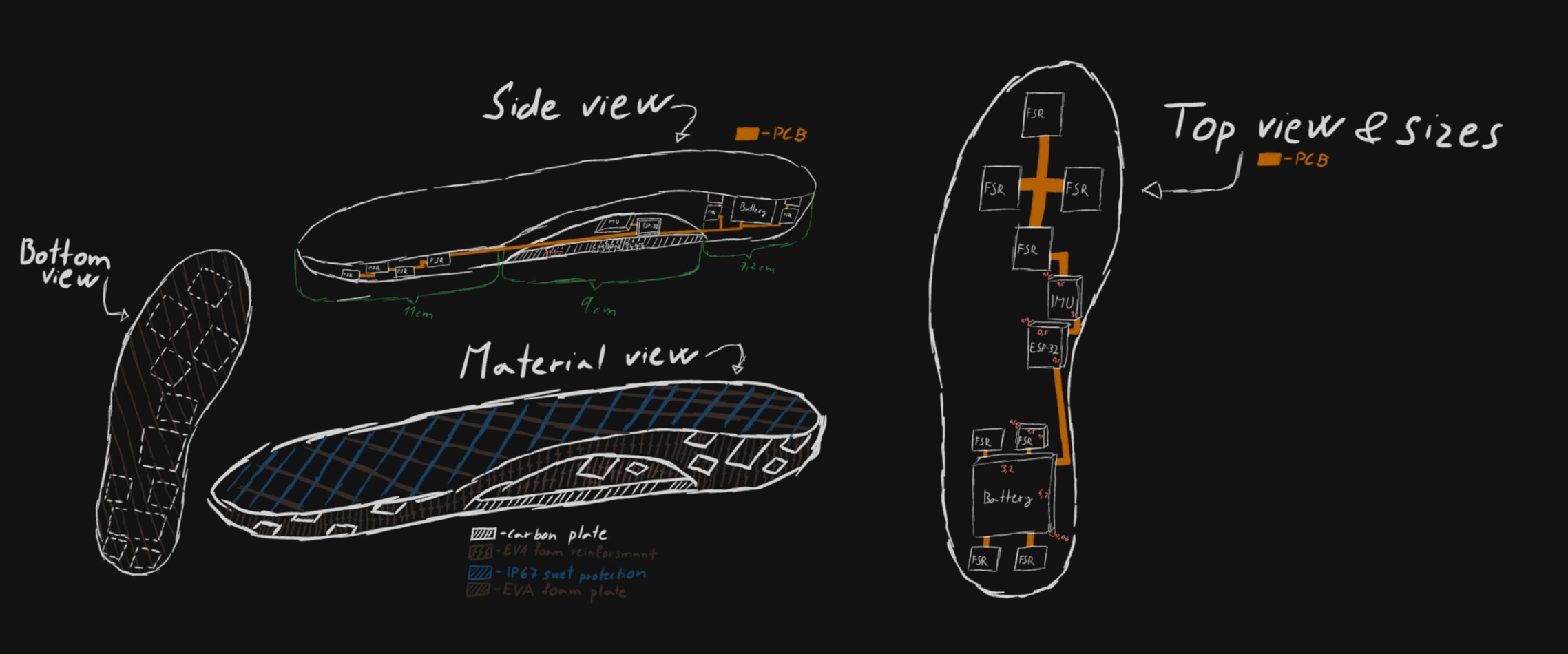 Naše cesta začala jednoduchým pozorováním: běžci často trpí zraněními způsobenými špatnou technikou. Chtěli jsme vytvořit něco, co by jim pomohlo zlepšit jejich běh a zároveň předešlo zraněním. Zde jsou první náčrty a myšlenky, které nás vedly k vývoji SoleSens.